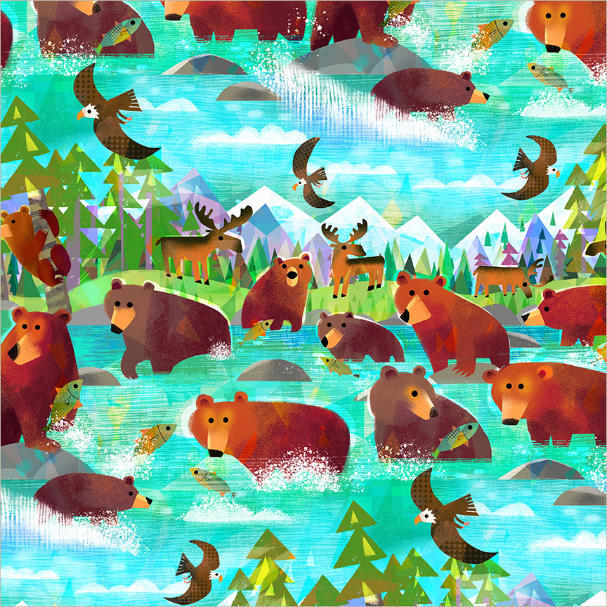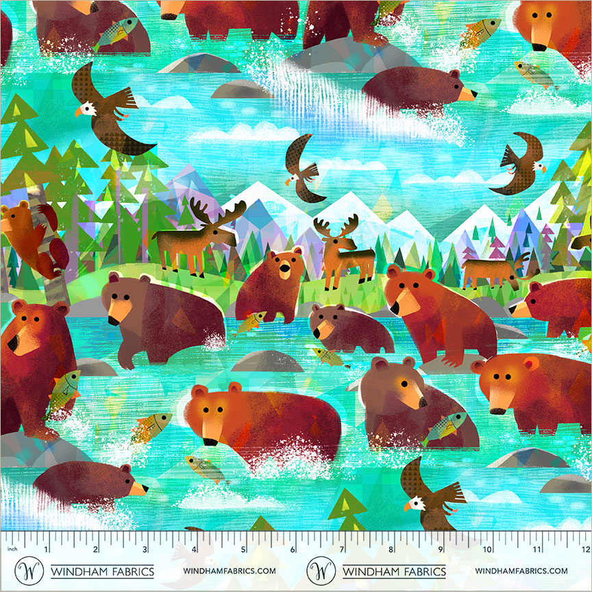 Animal Kingdom Gareth Lucas 55455D-1 Turquoise Bathing Bears Cotton
